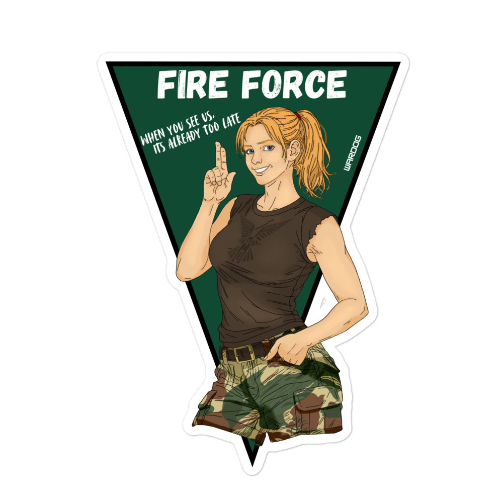 The Fire Force sticker celebrates speed, surprise, and the kind of confidence that comes from arriving by helicopter with no intention of staying long. Inspired by rapid reaction doctrine and blunt-force efficiency, it signals an appreciation for initiative over planning and momentum over restraint.